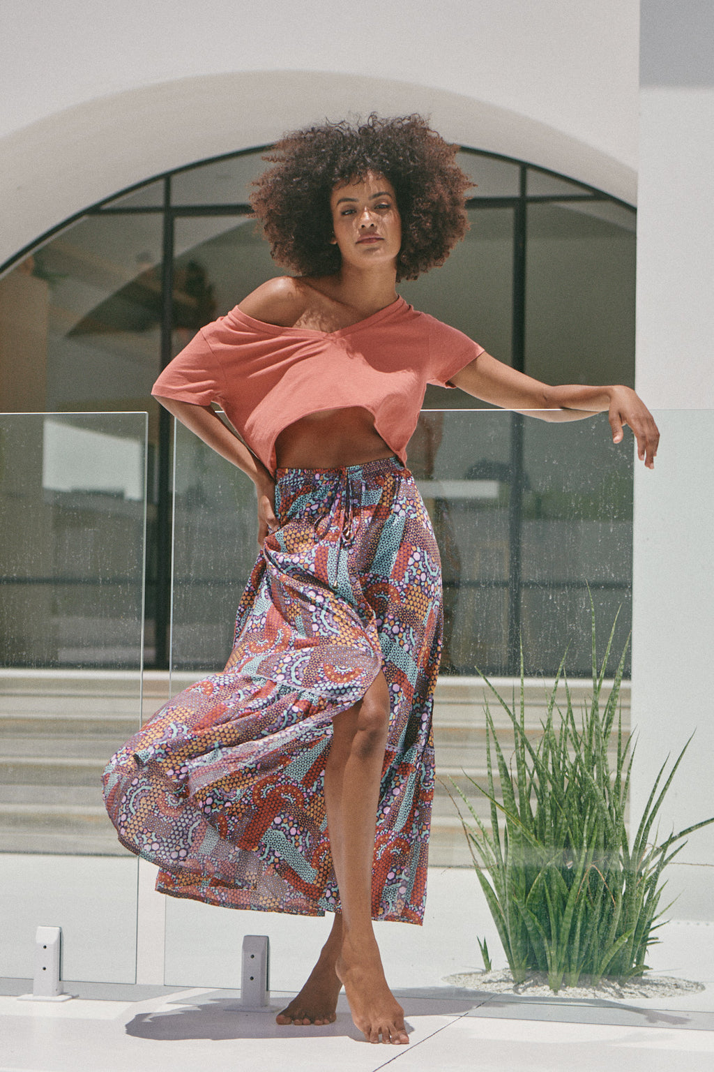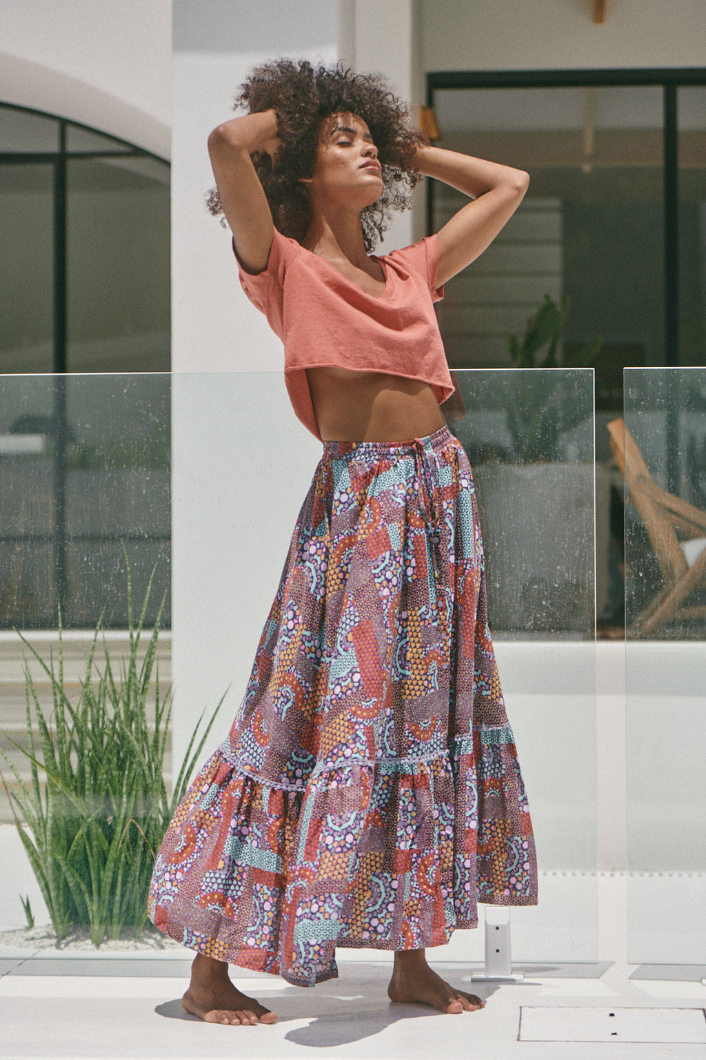 Designed to take you from sunrise to sunset featuring a button-front exaggerated high-rise maxi skirt with waist tie for added shape.