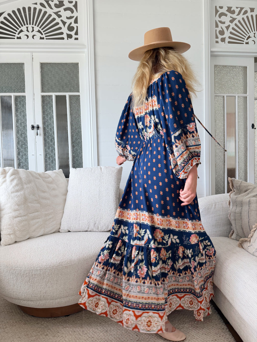 This timeless Maxi, Features gorgeous balloon sleeves. The bust line has a piping detail yoke with embroidered frill on the sleeve and skirt layer.