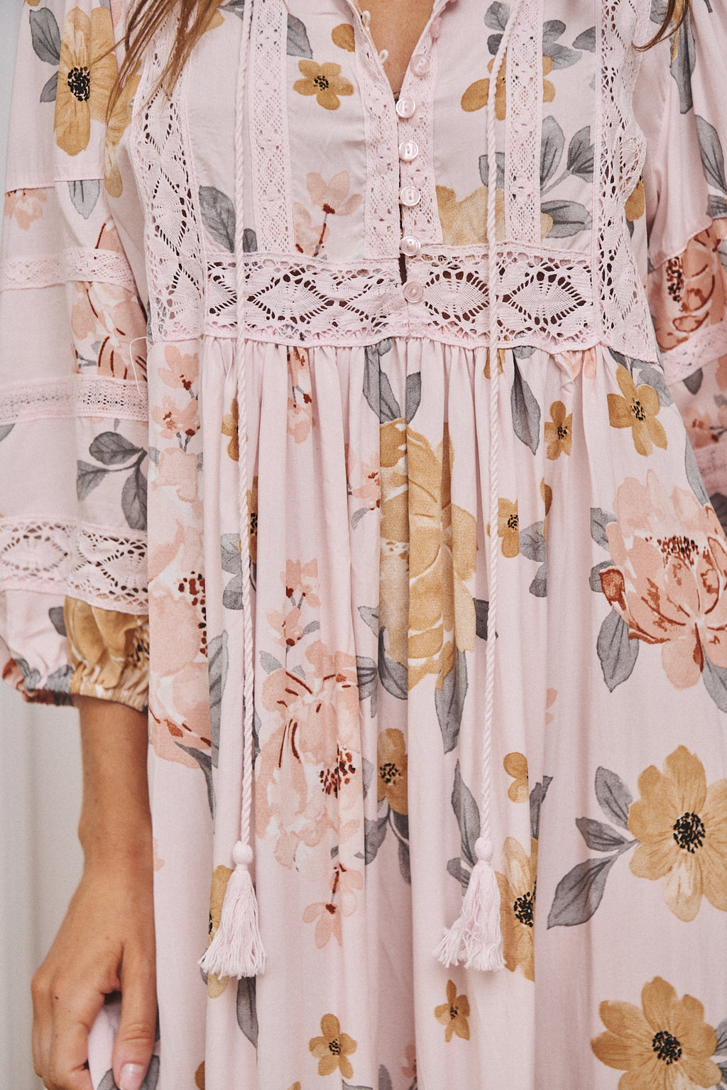 The Meadow Maxi is all about effortless charm and timeless style. Featuring a gorgeous border print, this beauty has a button-front bust with delicate lace detailing on the bodice and sleeves. The elegant mid-length sleeves with soft elastic cuffs add comfort and ease, while the floaty, full-length skirt falls gracefully to the ankle with subtle side splits for a breezy finish. A dress that moves with you, perfect for sunny days and relaxed evenings alike.