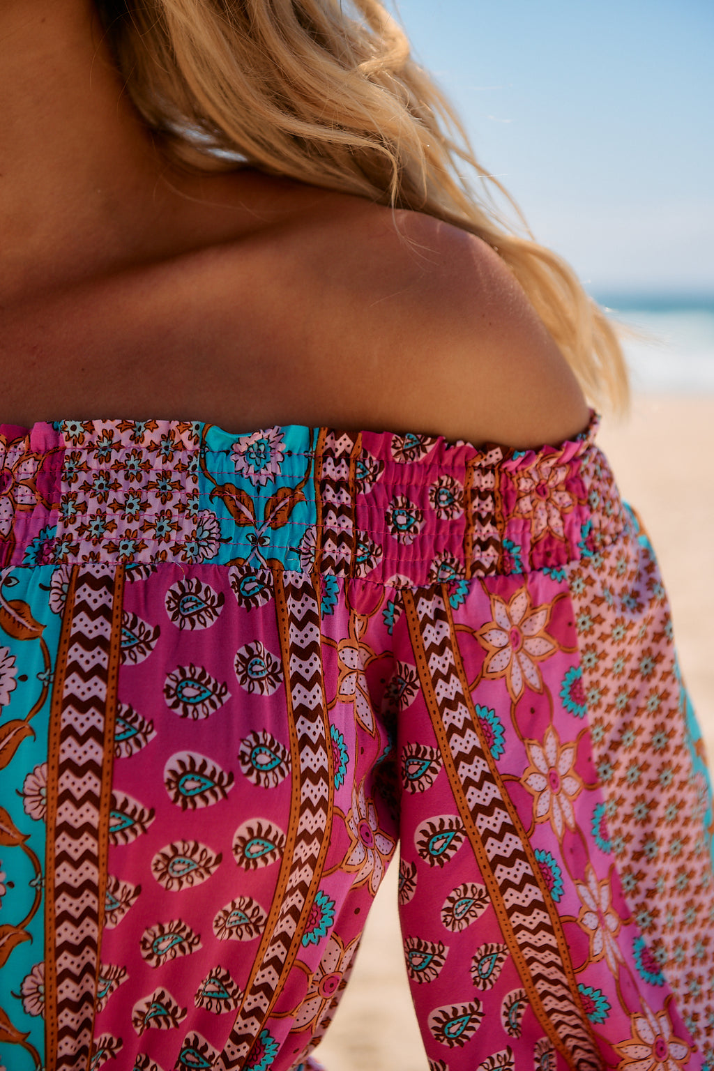 Stun all season long in this forever classic maxi dress featured in an off-the-shoulder, shapeless silhouette with sash detail and frilled hem for added shape.