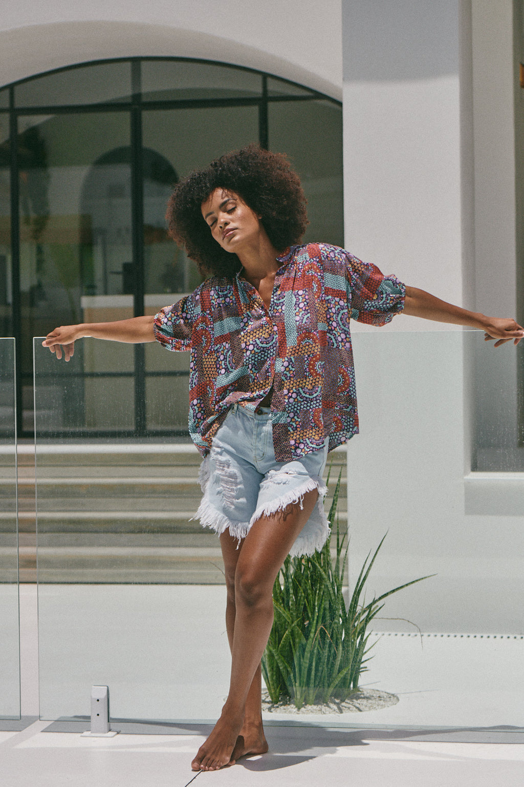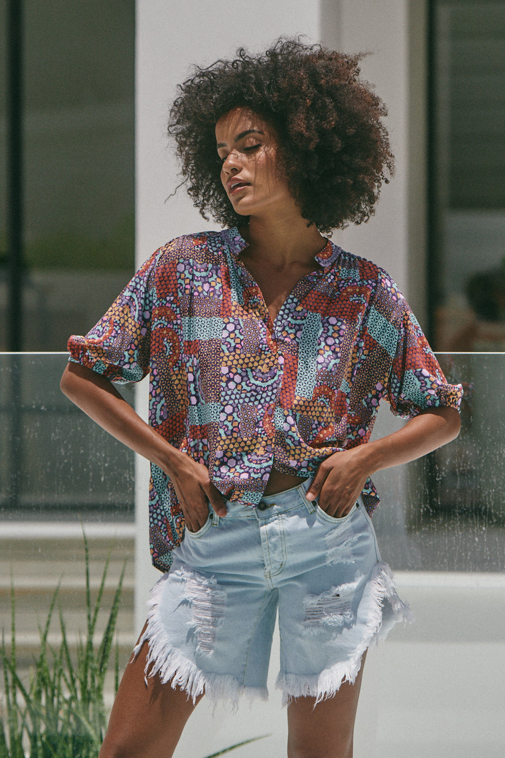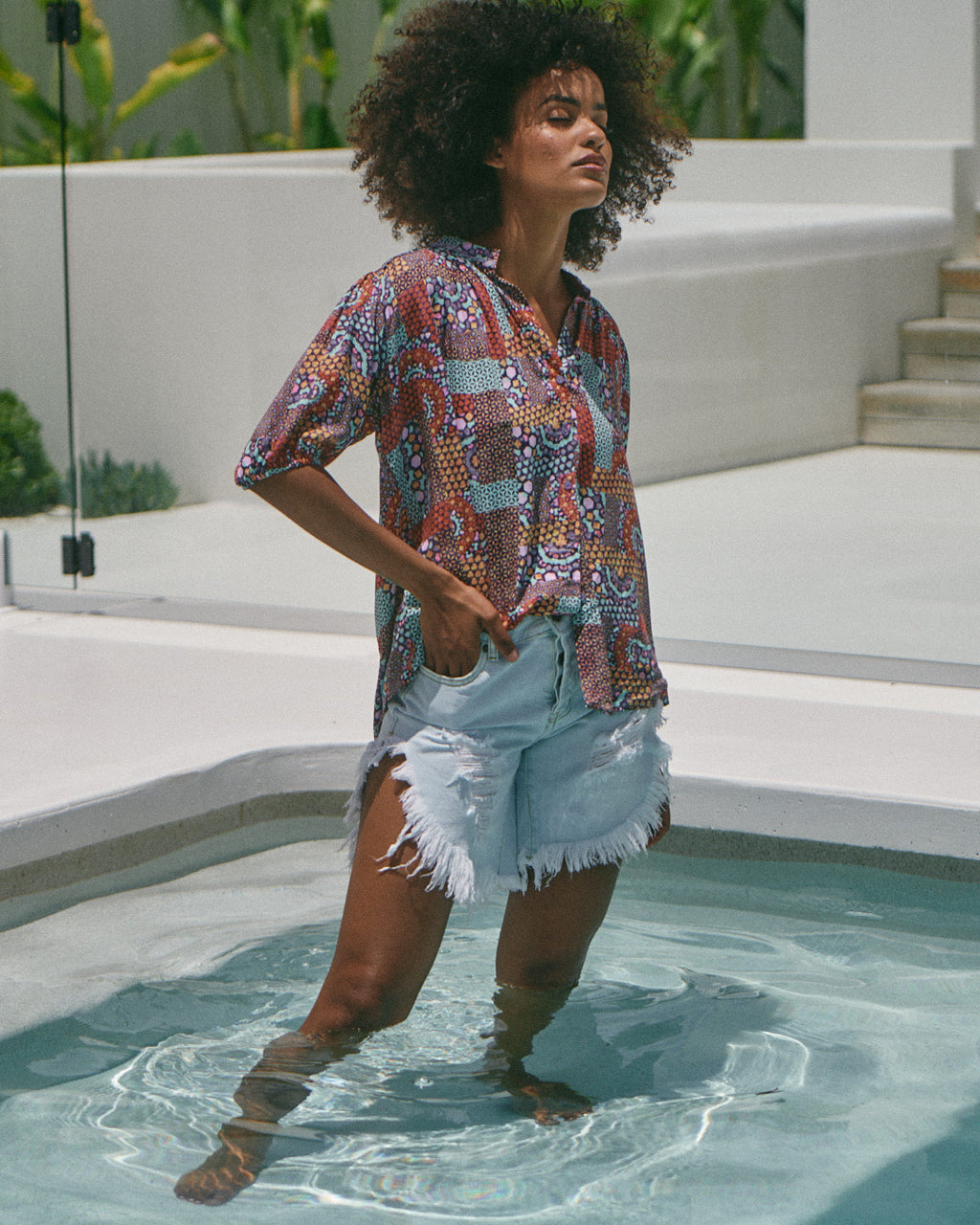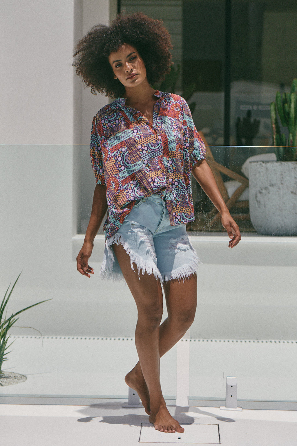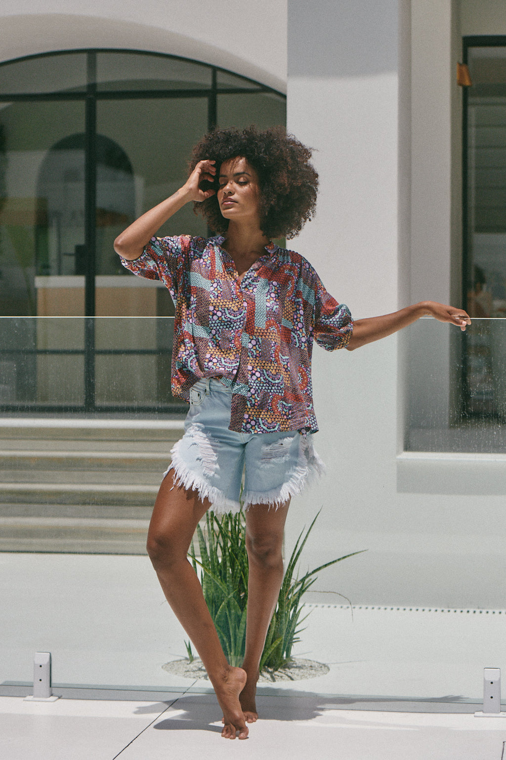 An effortless essential, this soft and drapey blouse is a must have as it can been worn so many ways. Crochet trimming and button through for added dimension.