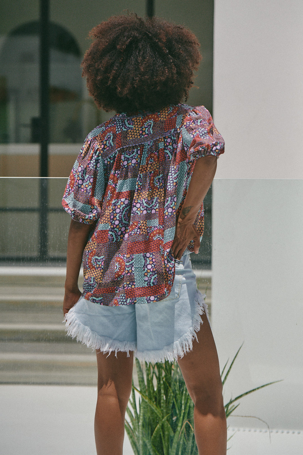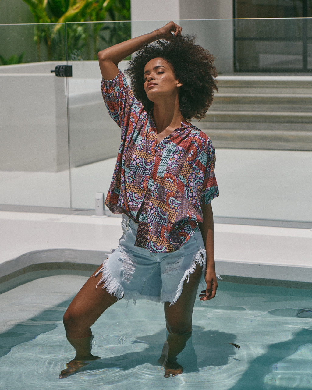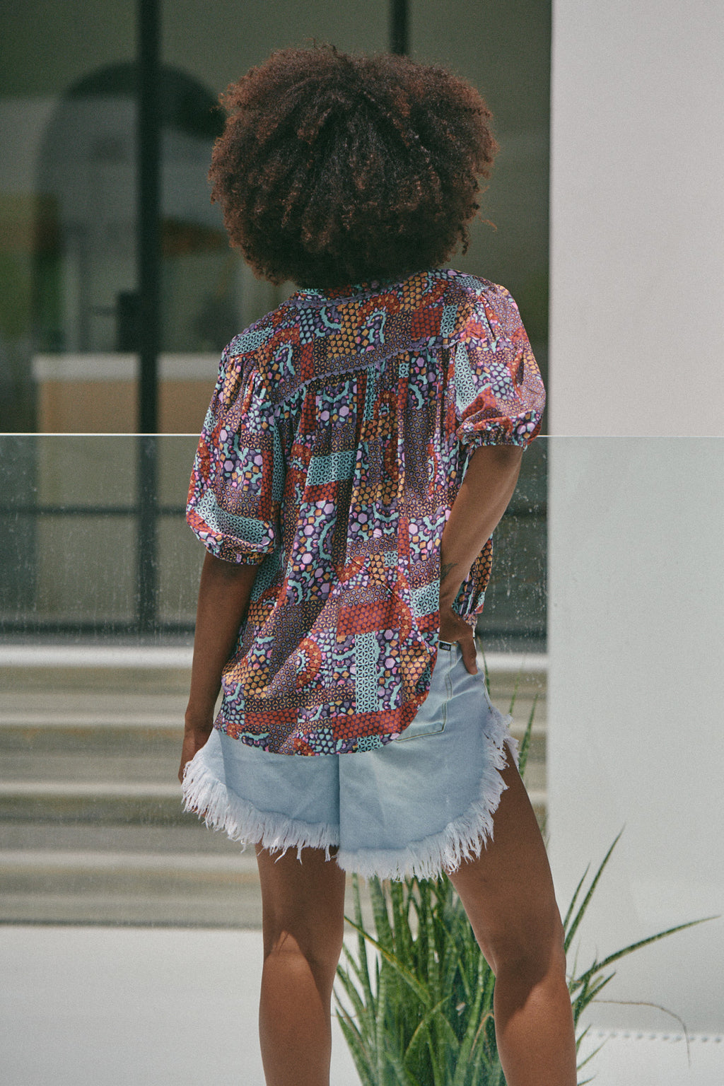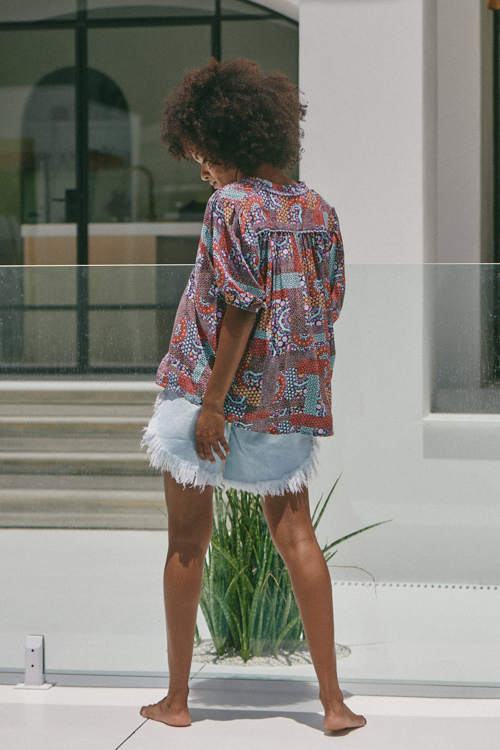 An effortless essential, this soft and drapey blouse is a must have as it can been worn so many ways. Crochet trimming and button through for added dimension.