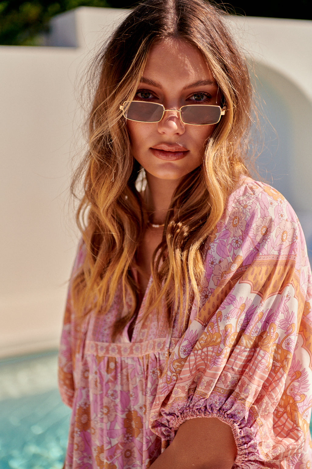 Just as effortlessly comfortable as it is stunning. This mini has a fitted bust yoke with border panels and neck ties accented by floaty sleeves and loose skirt with frill detail and border trims.