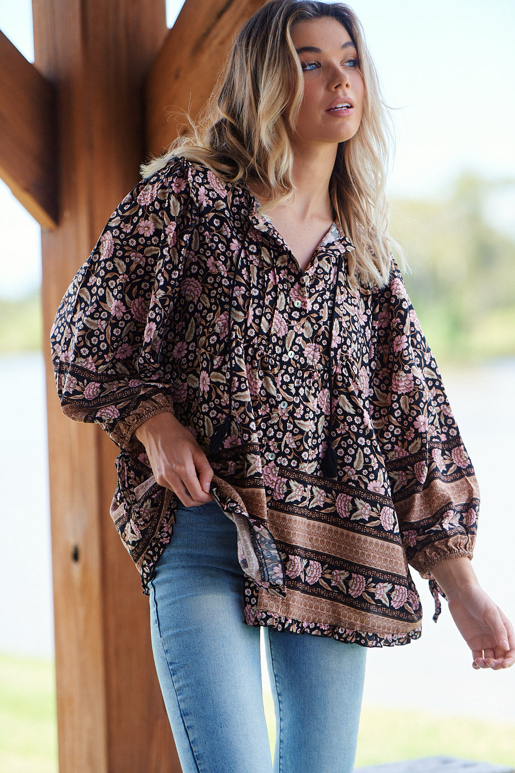 ~ Long sleeve loose fit with elastic cuff and tie detail.