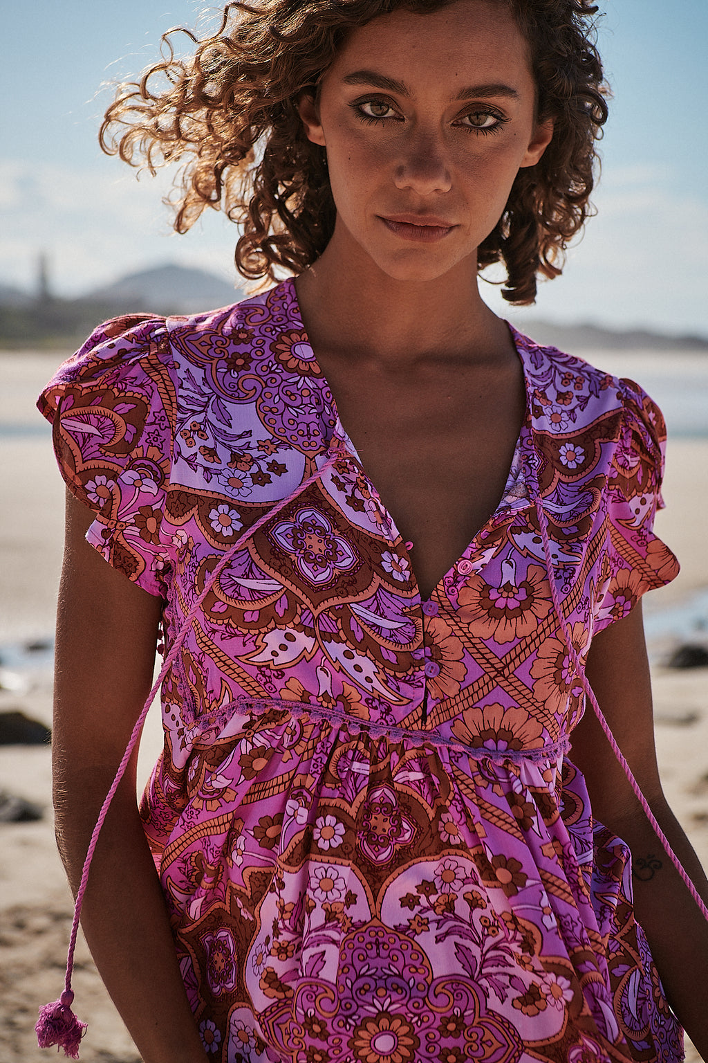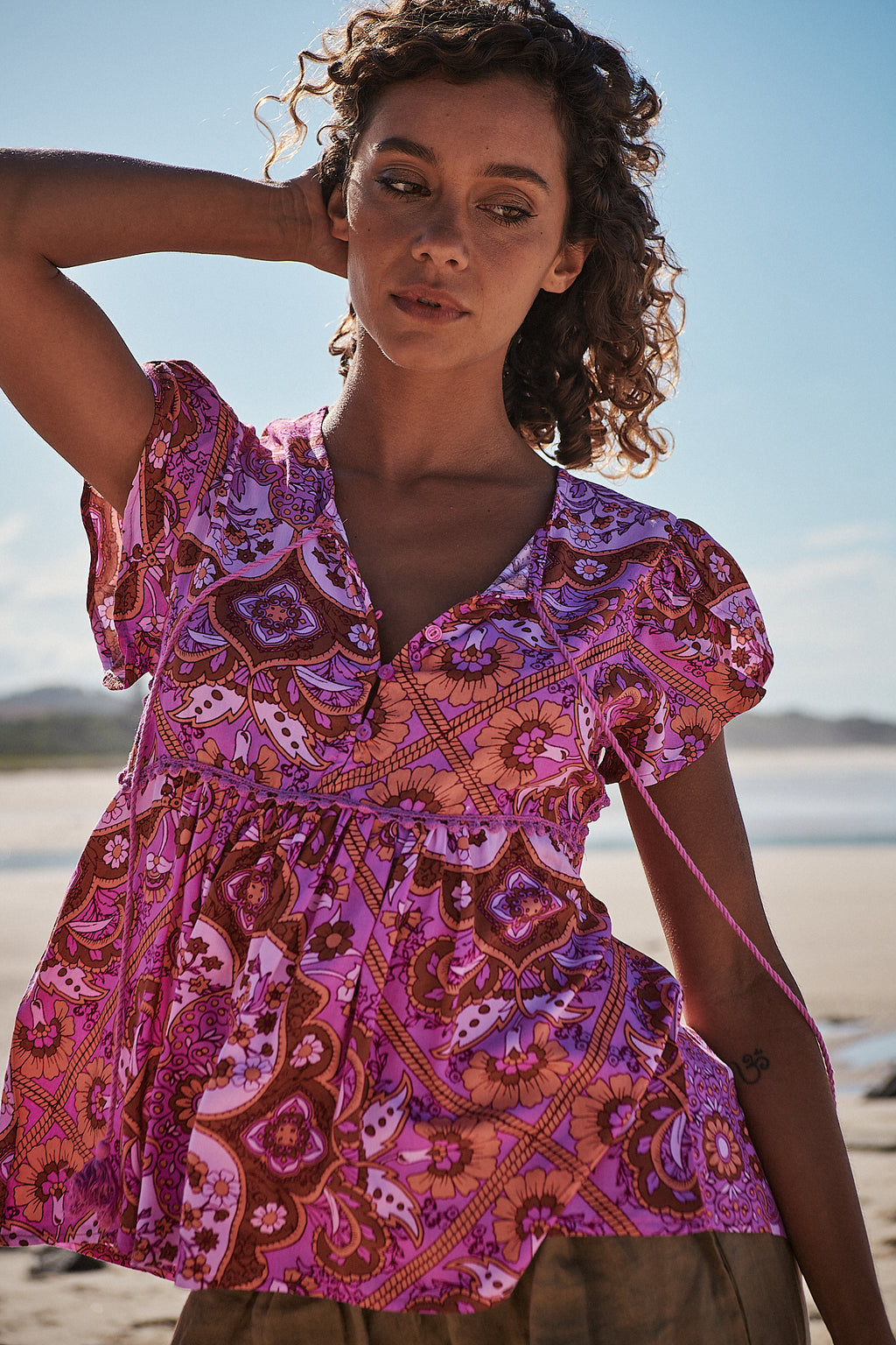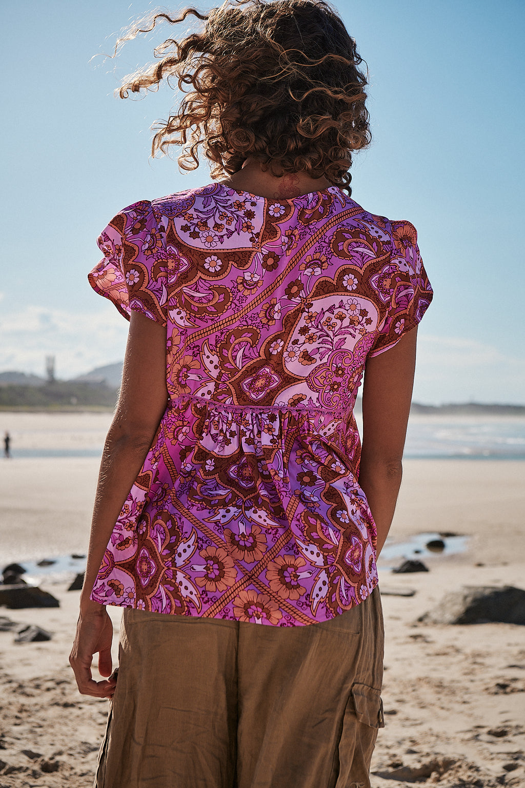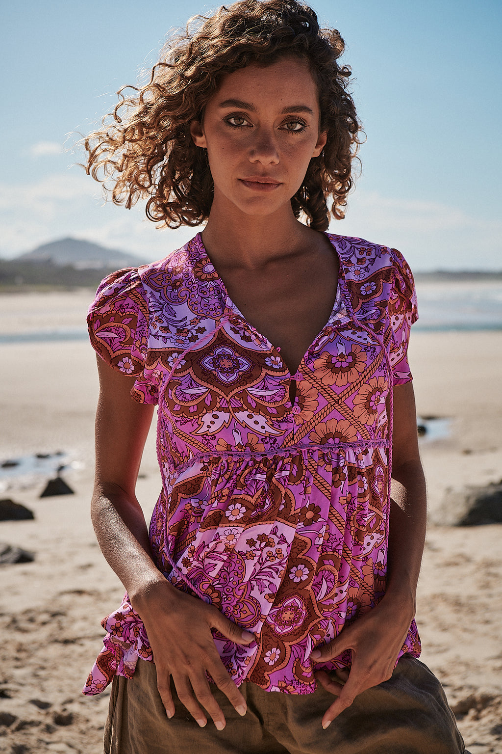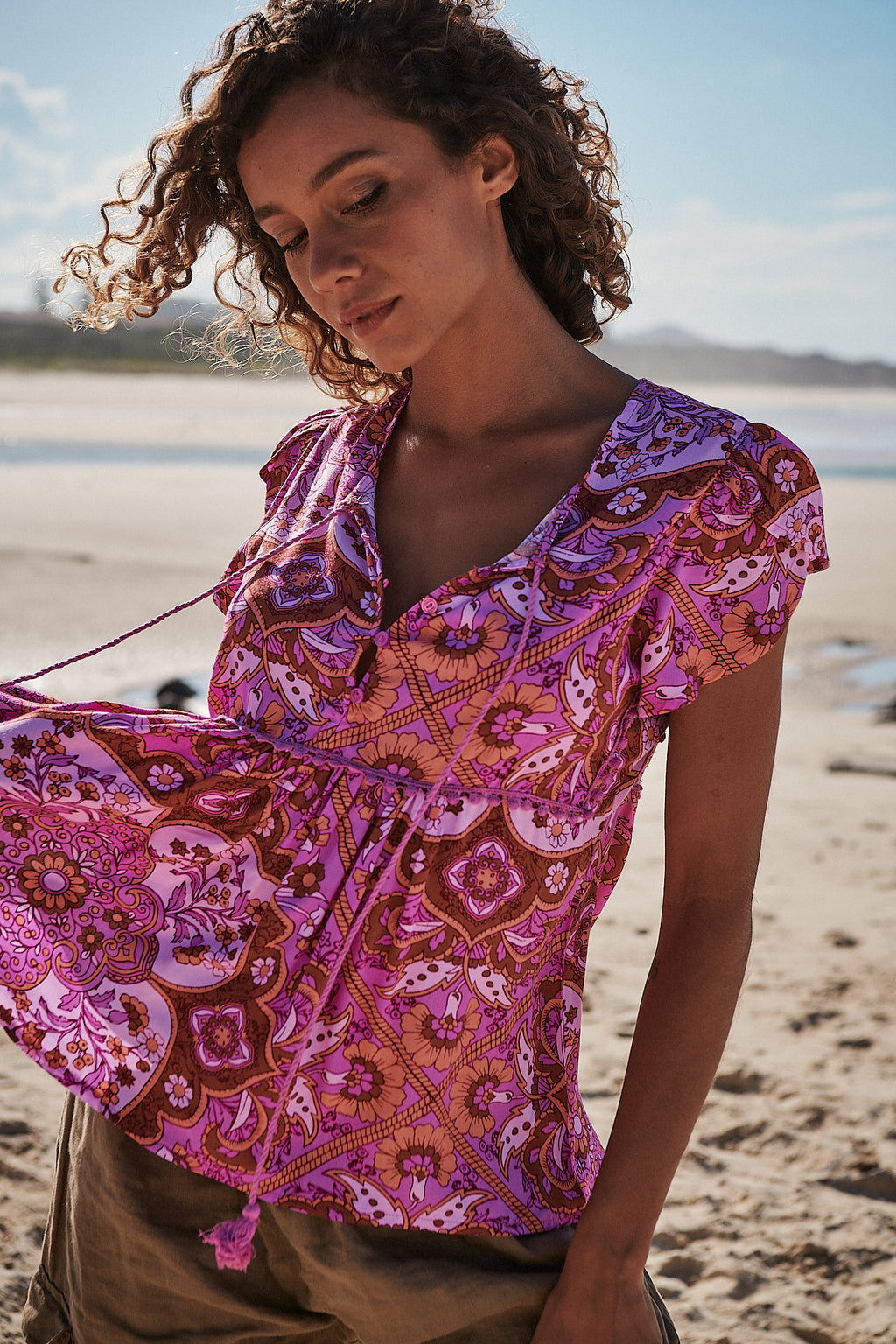 Pretty and capped-sleeved blouse featured in a pretty print with front tie feature in a slouchy silhouette.