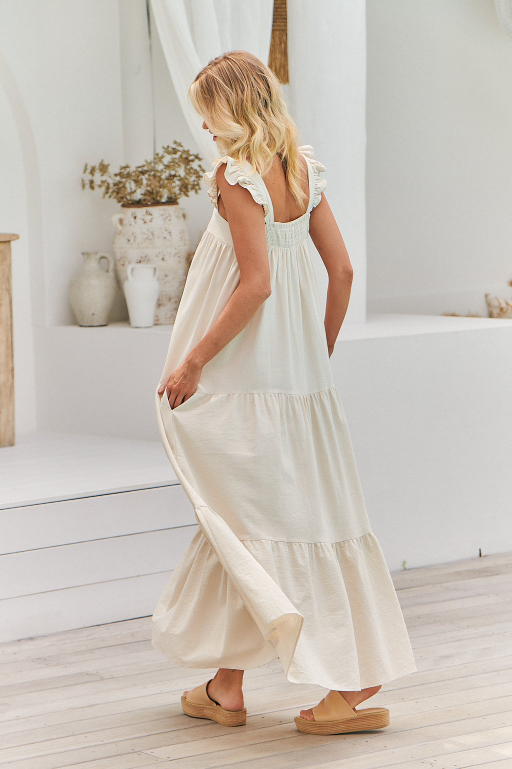 Turn heads in the stunning maxi dress featuring a delicate frill sleeve and v bustline yoke with floaty skirt and shirred back details.