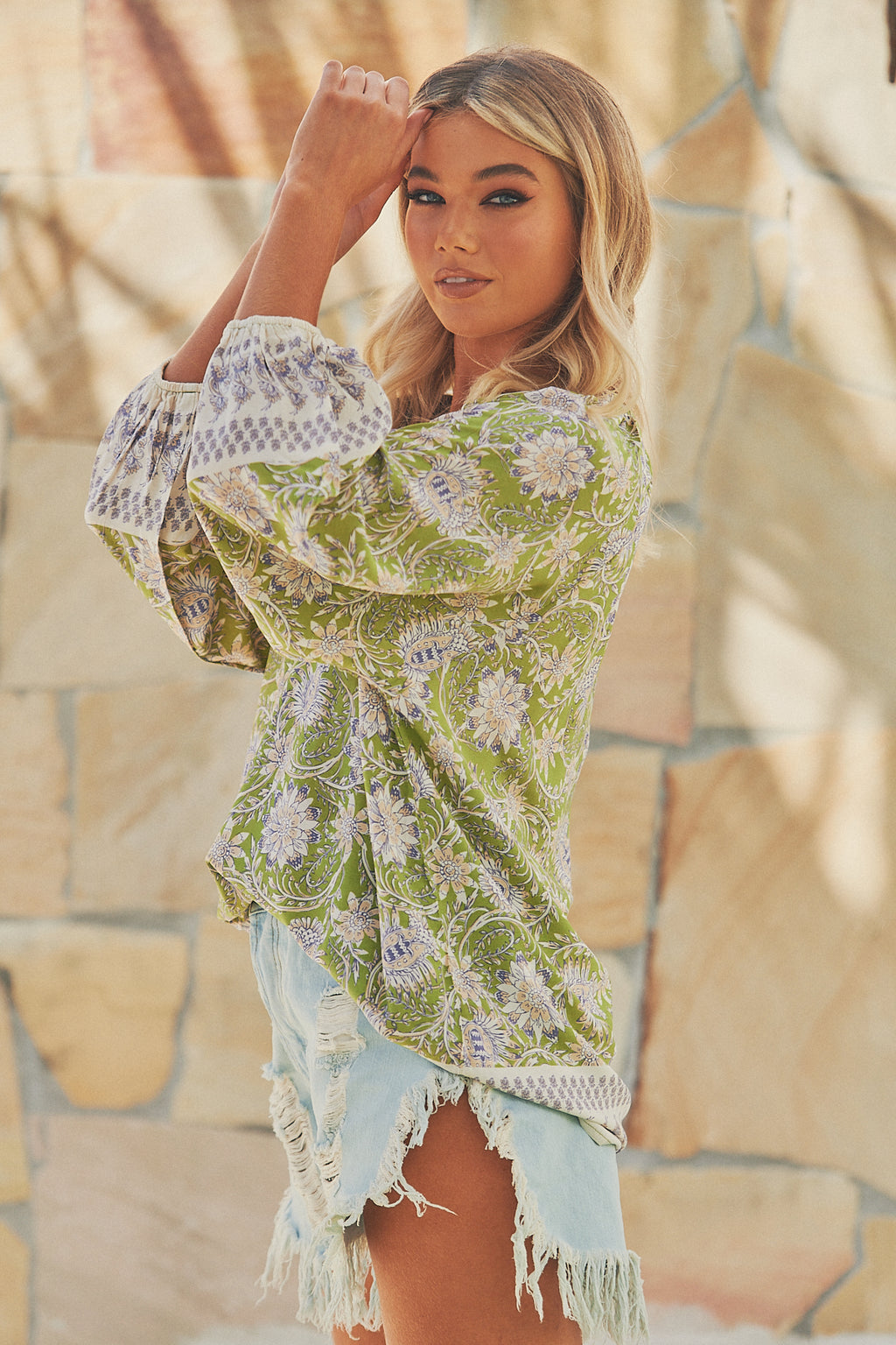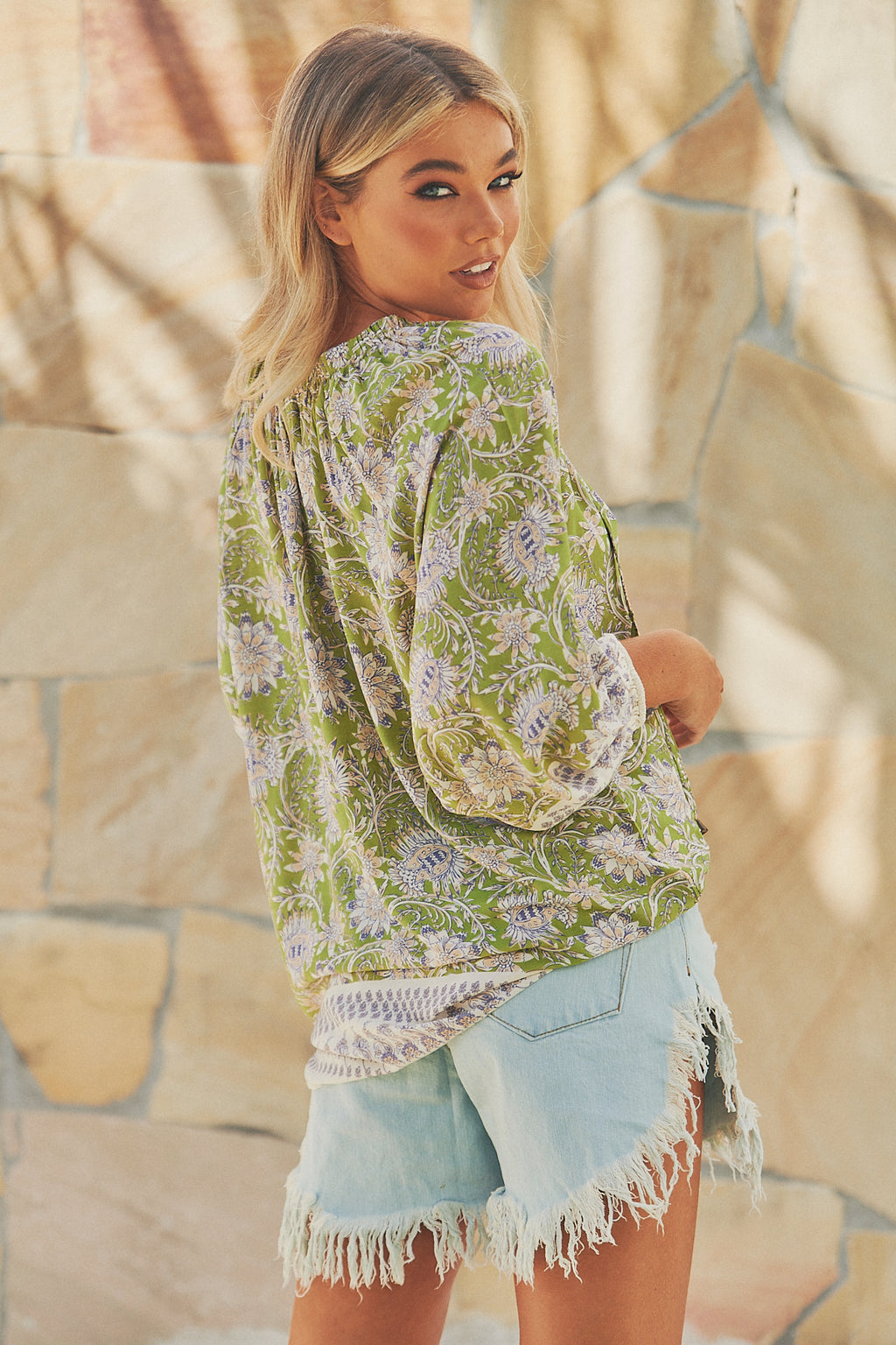 Stand out in this so special billowy blouse featured in a stunning Jaase exclusive print with elasticated mandarin collar for added dimension.