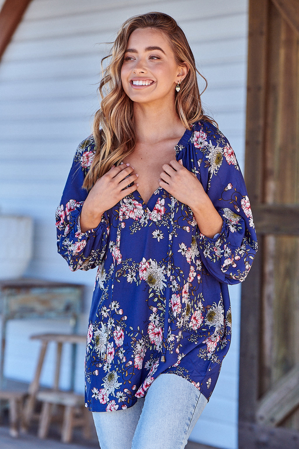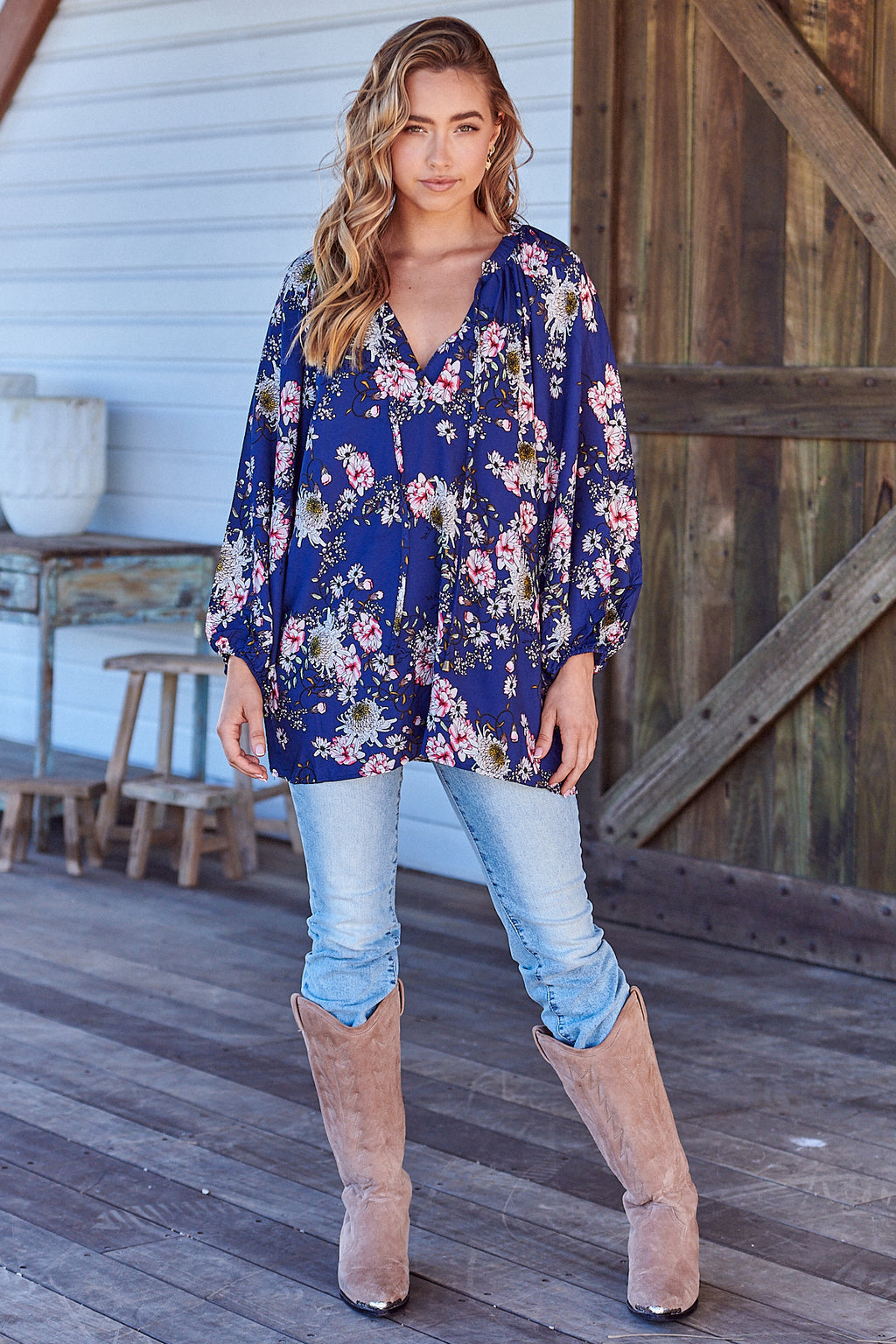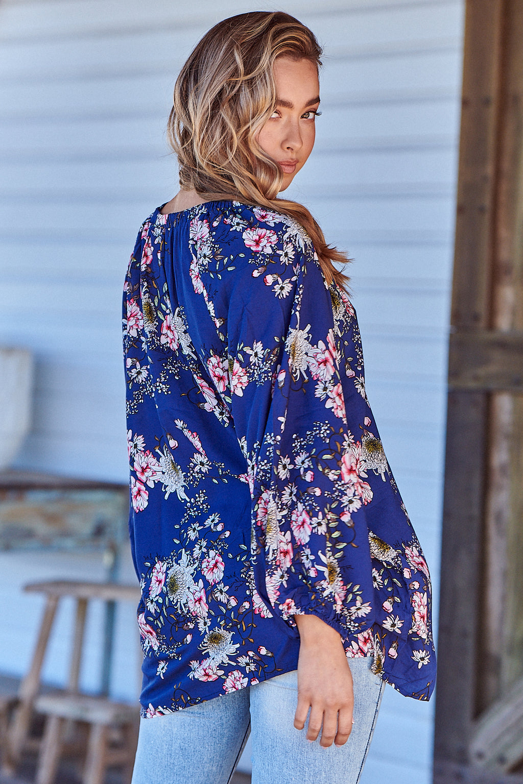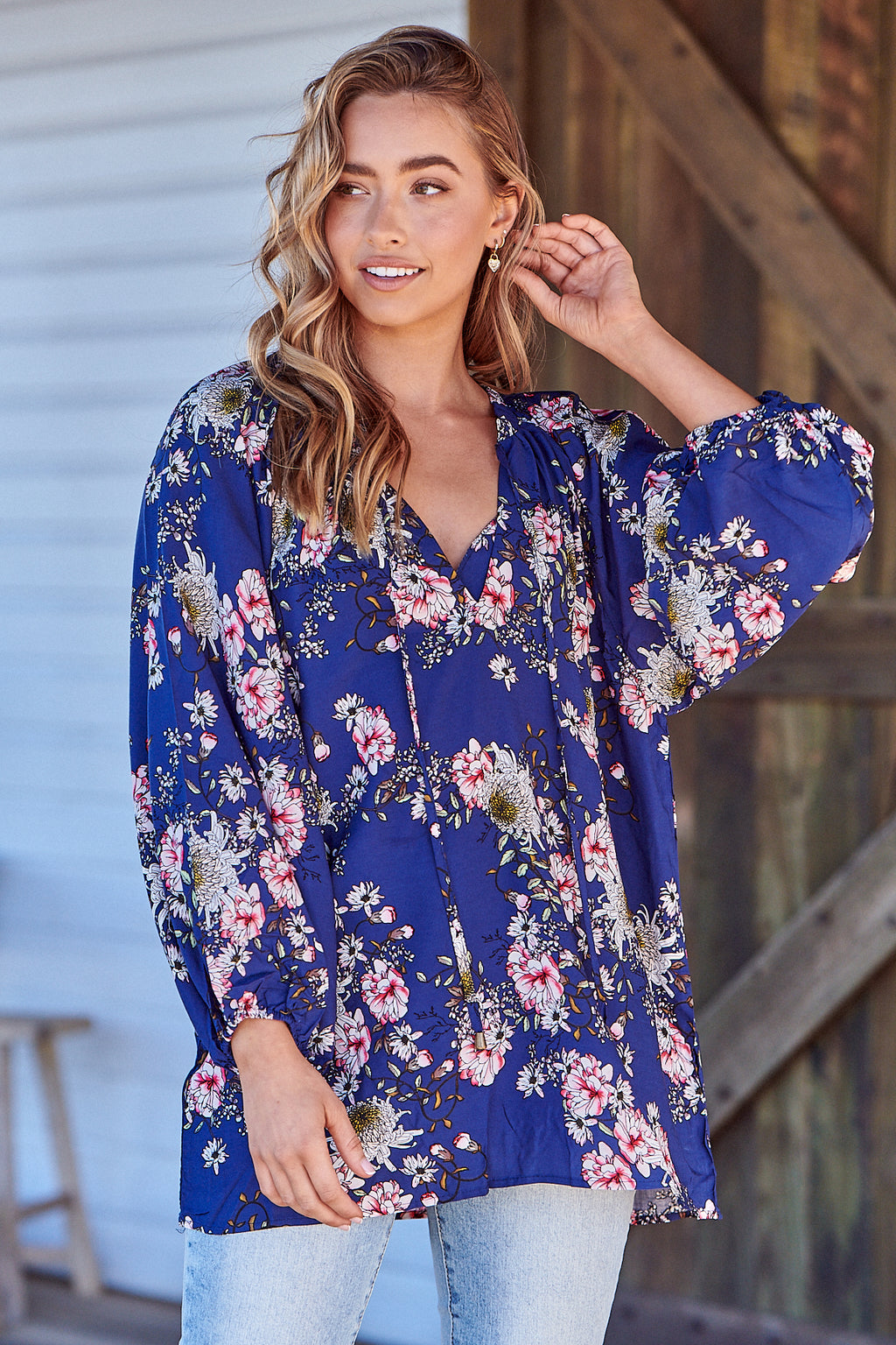 Stand out in this so special billowy blouse featured in a stunning Jaase exclusive print with elasticated mandarin collar for added dimension.