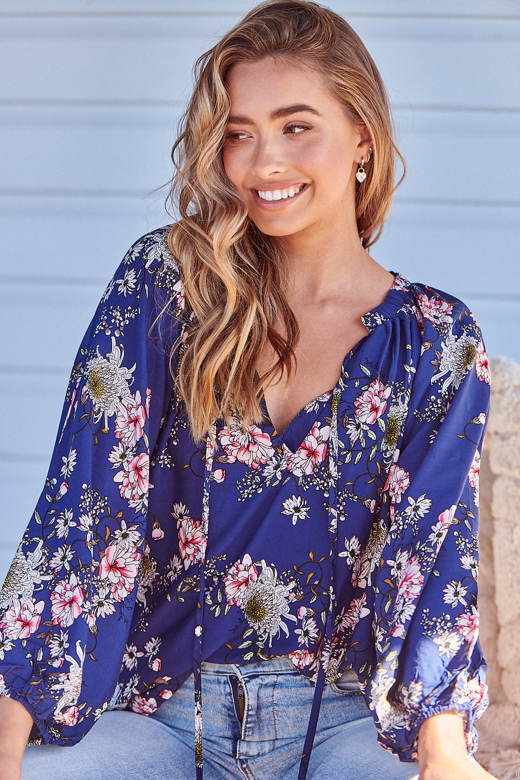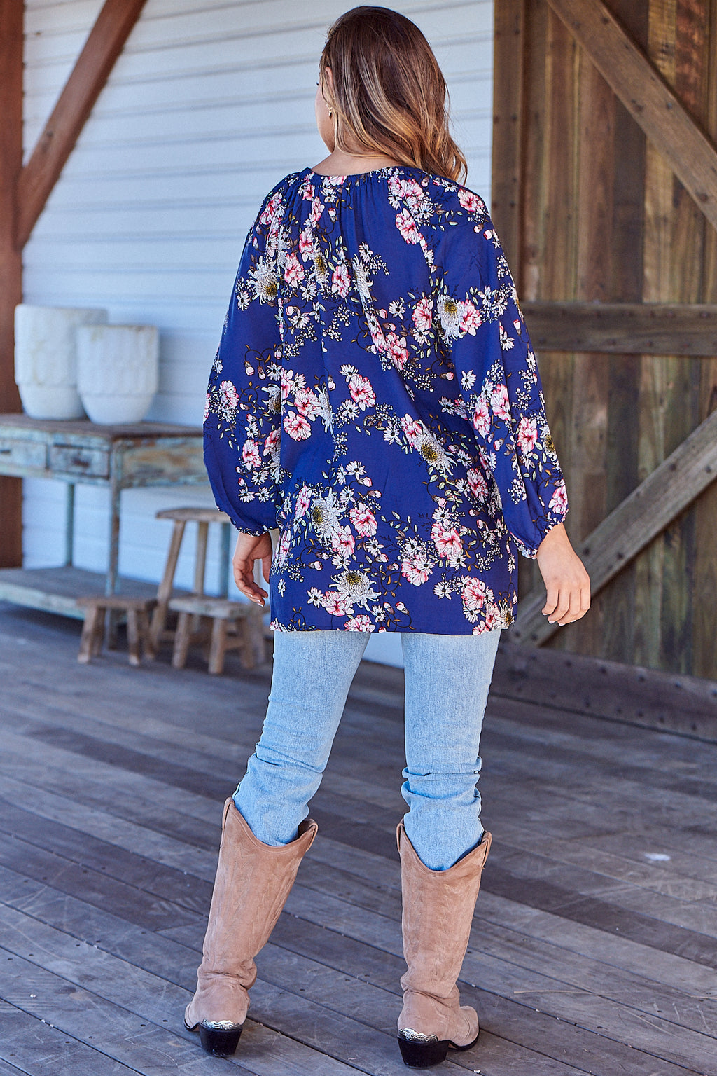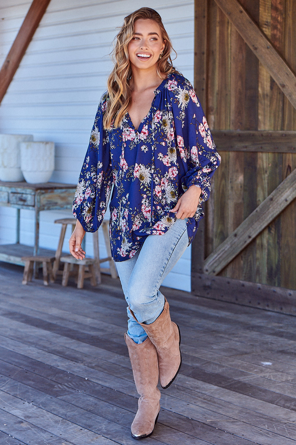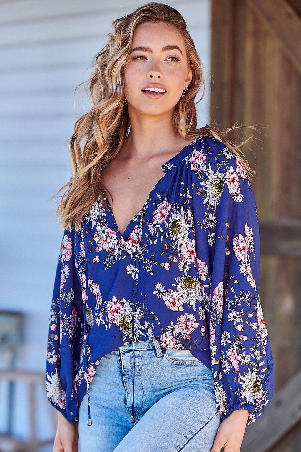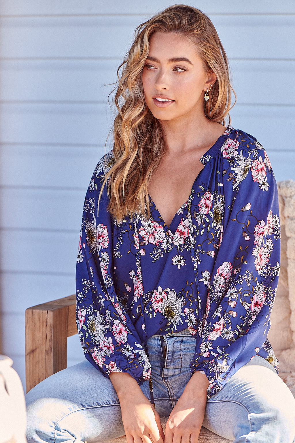 Stand out in this so special billowy blouse featured in a stunning Jaase exclusive print with elasticated mandarin collar for added dimension.