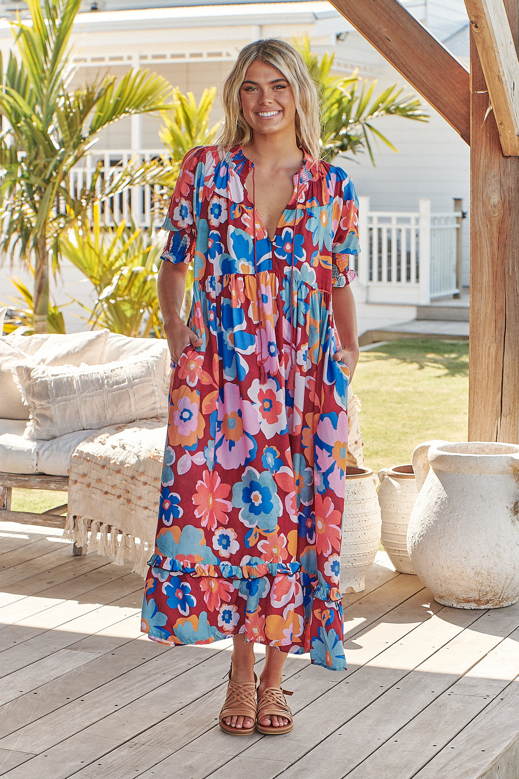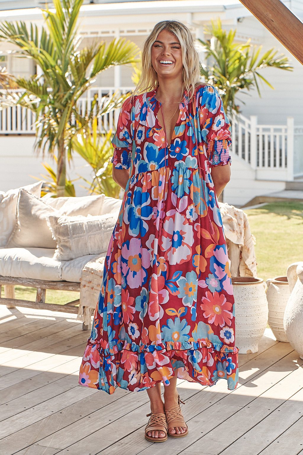 Effortless print midi dress featured in an A-line silhouette with a tiered pleated skirt, v neckline and ruffled trim.