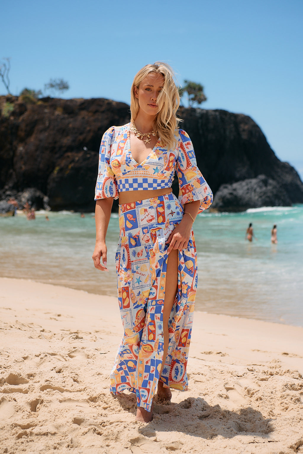 This vibrant maxi skirt features a colourful patchwork print and a flowing, lightweight silhouette perfect for summer. Designed with a comfortable waist and a breezy front split, it moves beautifully and adds a fun, beachy feel to any outfit. Pair it with the matching top or your favourite basic for an effortless holiday look.