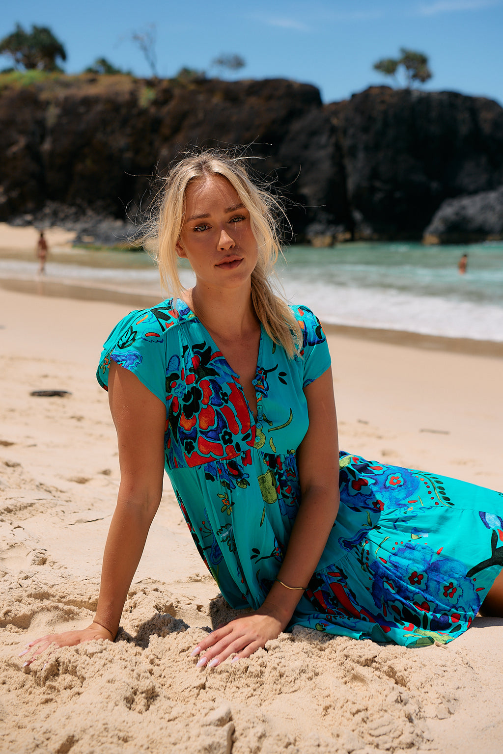 So mod mini dress featured in a boldly patterned design with a button down-neckline.
